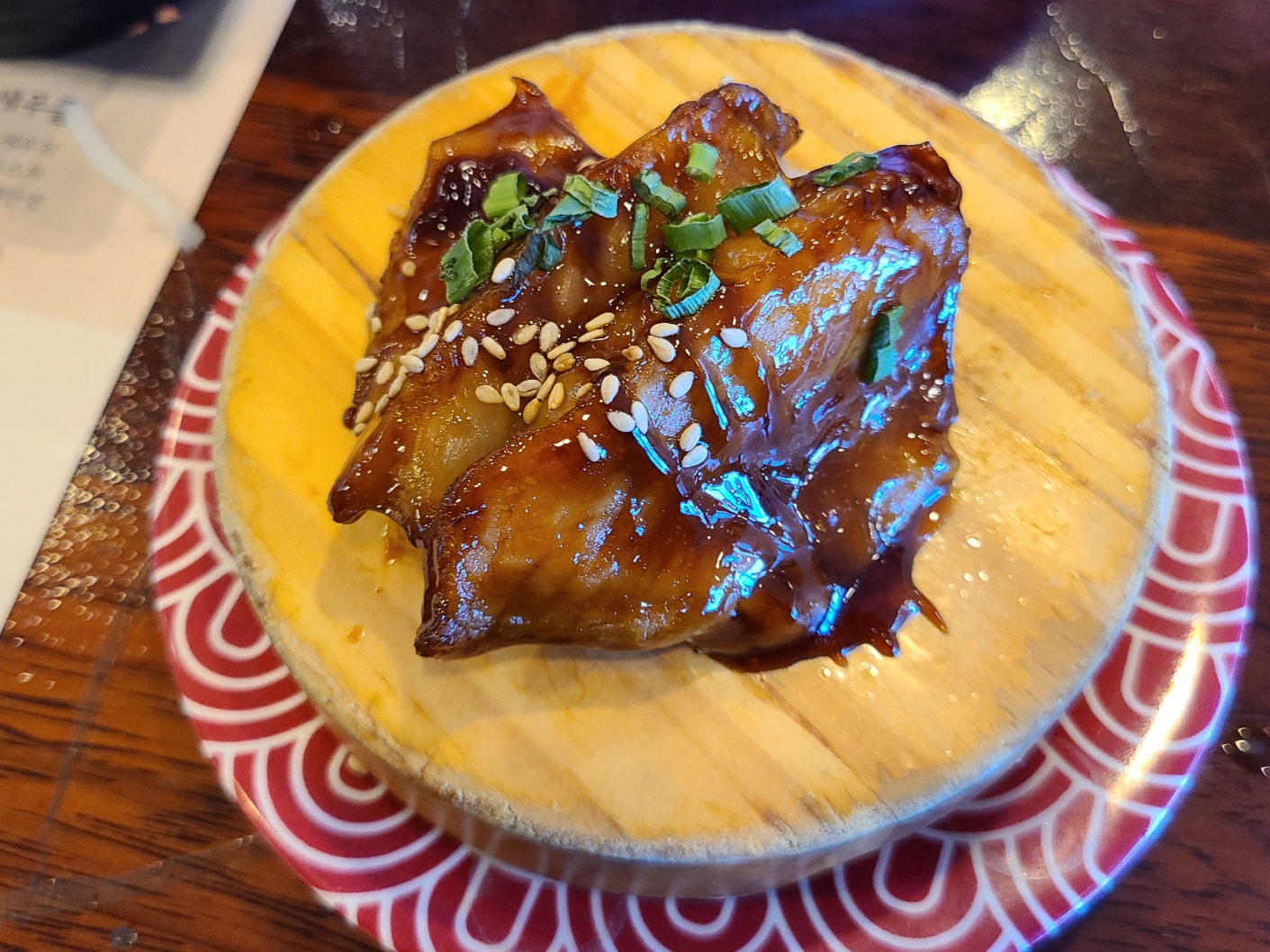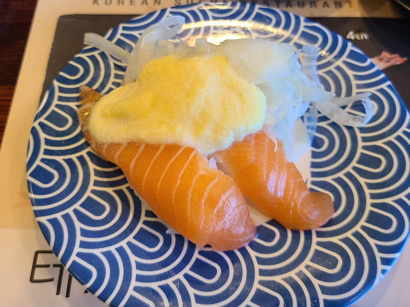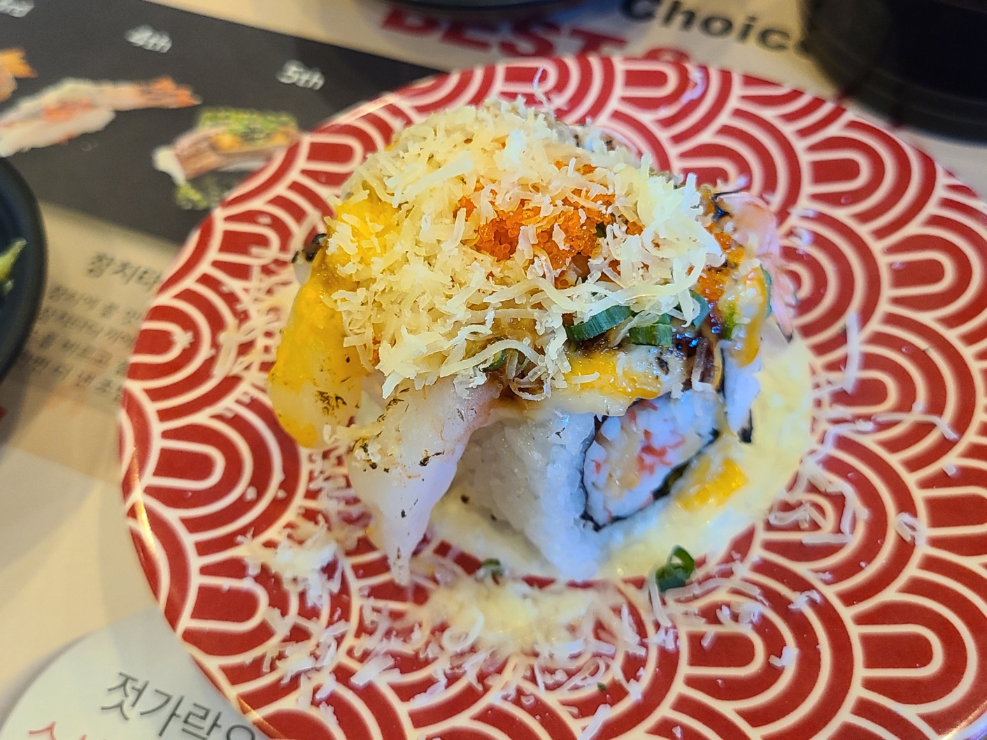 먹었던 모든 초밥이 맛있었습니다. 제가 좋아하는 양파연어는 많지 않아서 1개 밖에 먹지 못하였습니다. 매장 1위라고 되어있었던 육회초밥도 육회 양념이 맛이 좋았습니다. 무엇보다 빨간 색 접시의 초밥들은 직원분들이 바로 따뜻하게 데워주셔서 그 맛이 더 좋았습니다. 가장 많이 먹은 건 양파연어롤이었습니다.