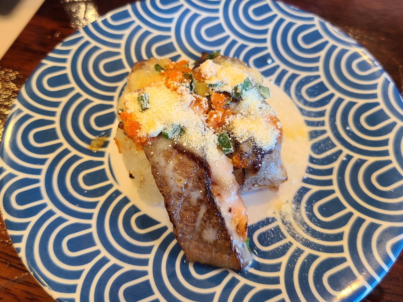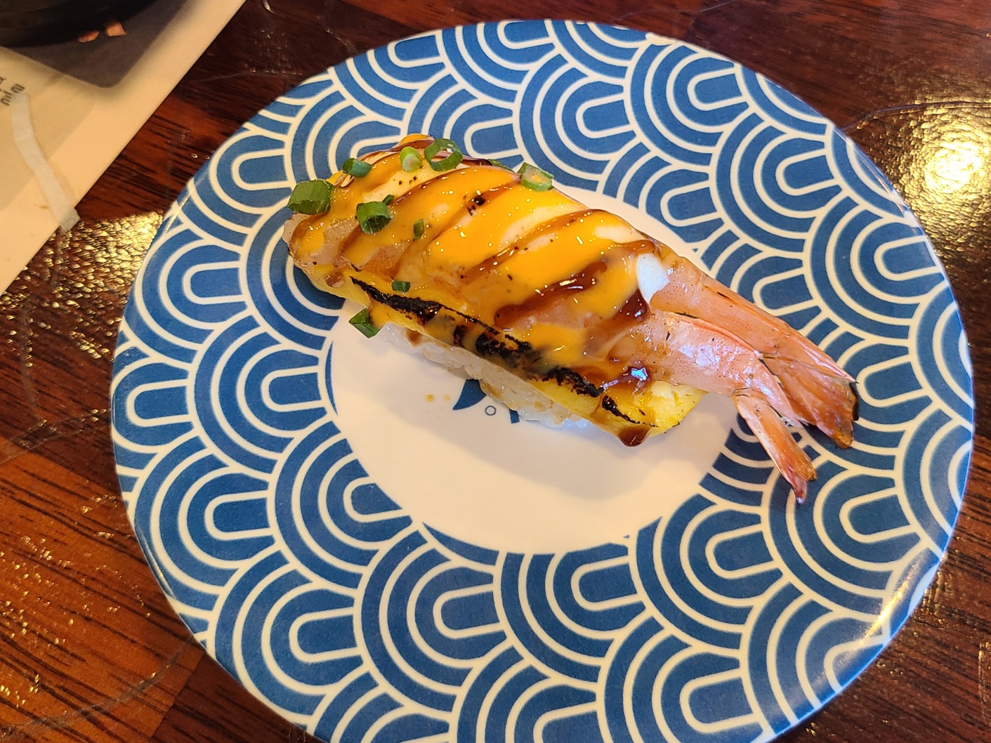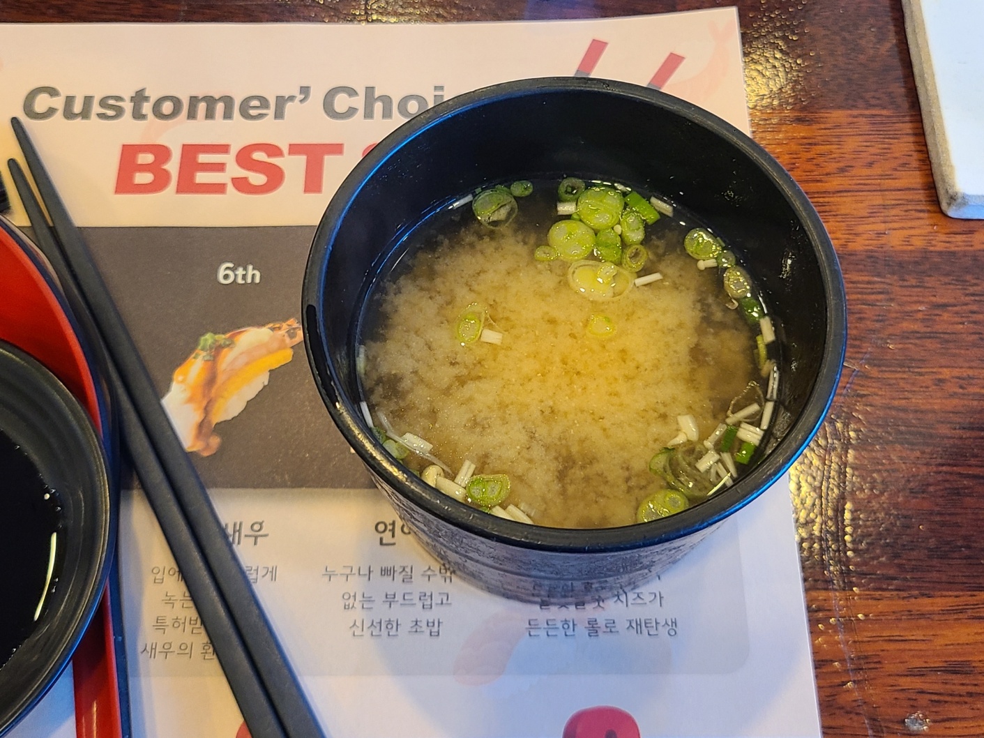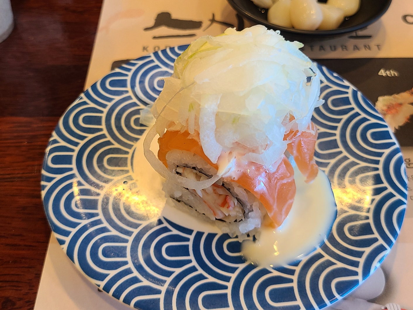 먹었던 모든 초밥이 맛있었습니다. 제가 좋아하는 양파연어는 많지 않아서 1개 밖에 먹지 못하였습니다. 매장 1위라고 되어있었던 육회초밥도 육회 양념이 맛이 좋았습니다. 무엇보다 빨간 색 접시의 초밥들은 직원분들이 바로 따뜻하게 데워주셔서 그 맛이 더 좋았습니다. 가장 많이 먹은 건 양파연어롤이었습니다.