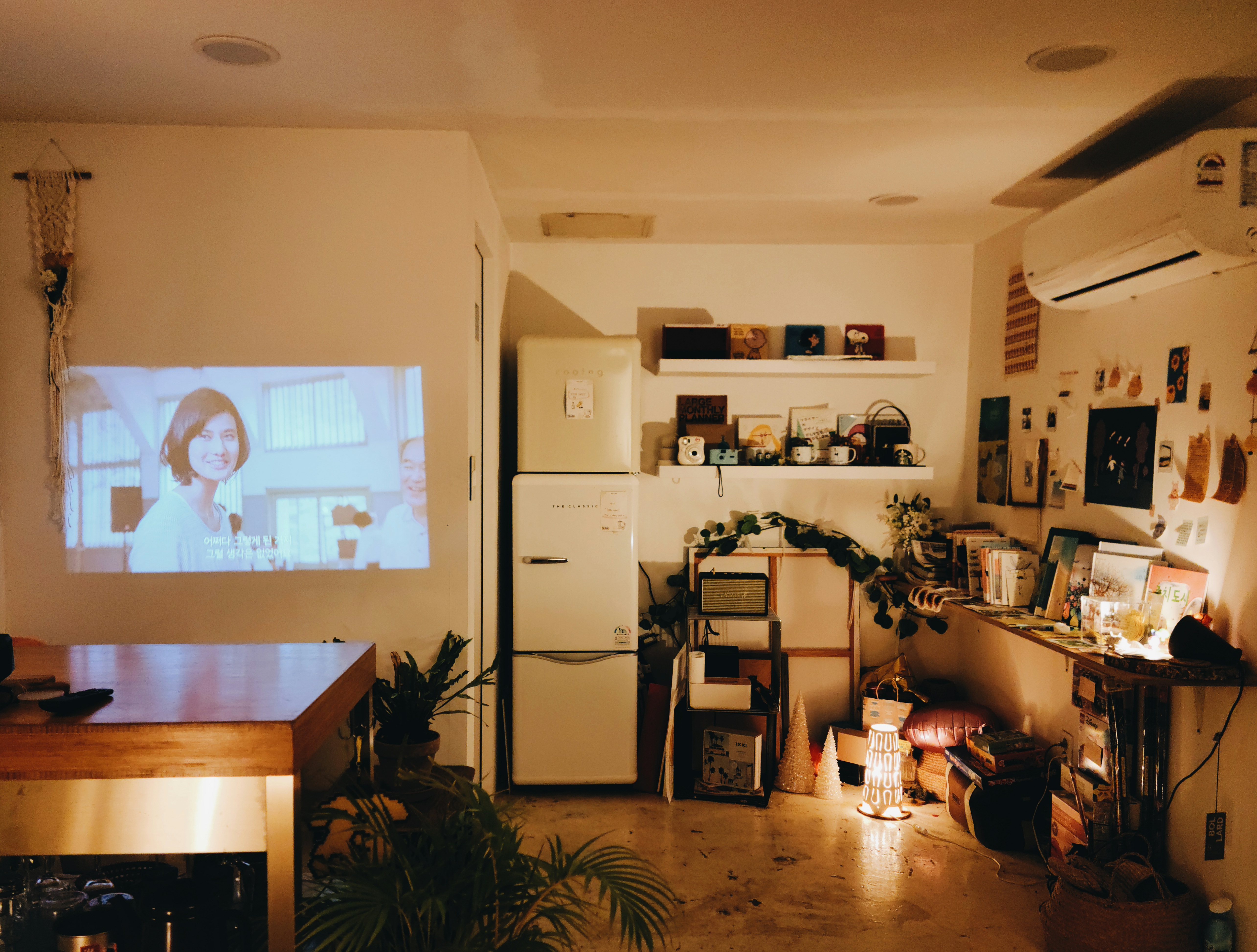 숙소 1층 뒷편에 고백다이닝이라는 장소가 따로 있었습니다. 숙소 투숙하는 분들을 위한 특별한 공간인데 내부에는 작은 빔으로 일본영화가 틀어져 있었고 테이블과 의자가 있어서 각자 음식이나 술을 가져와서 먹을 수 있게 되어있었습니다. 내부 인테리어가 인상적이어습니다. 따뜻한 느낌의 공간입니다. 아침에는 그곳에서 조식을 먹을 수 있는데 조식을 나온 파니니가 정말 맛있었고 고백다이닝의 큰 창으로 보이는 제주도 시골 풍경이 아름다웠습니다.