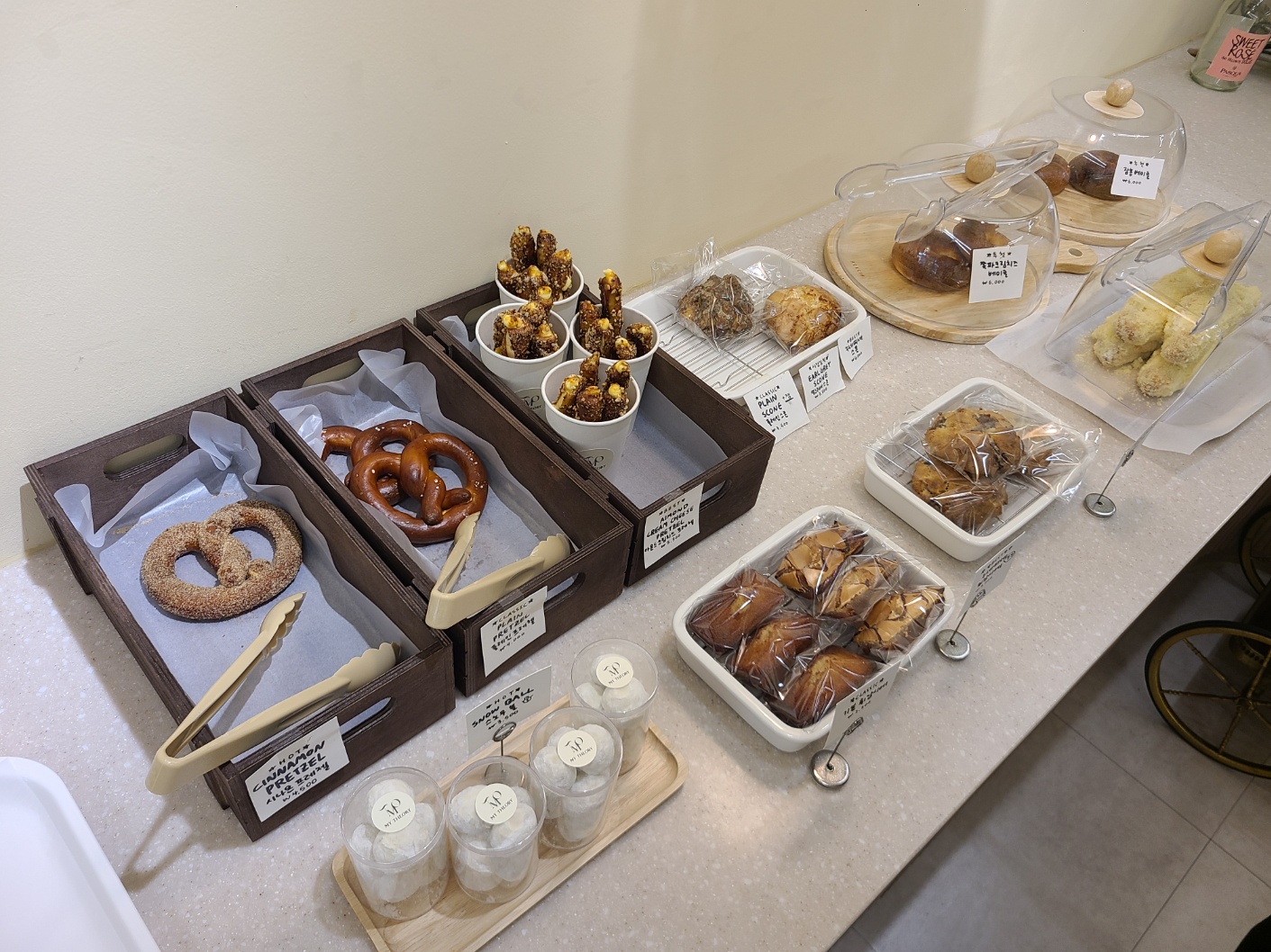 테이블은 4개 정도 있었고 커피와 함께 먹을 수 있는 프레젤 들과 스콘, 베이글들이 있었습니다. 빵 종류는 많지 않아서 오히려 좋았습니다.