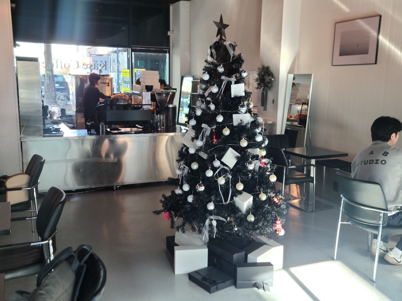 모던한 느낌의 인테리어가 마음에 들었습니다. 연말이라 크리스마스 장식들이 잘 꾸며져 있었습니다. 낮에 방문 했는데 밝은 분위기가 아니라서 오히려 더 좋았습니다. 너무 밝은 분위기보다는 약간 어두운 조명의 카페를 더 선호합니다. 카페 앞에 주차자리도 넉넉히 있어서 이용하기 편리했습니다