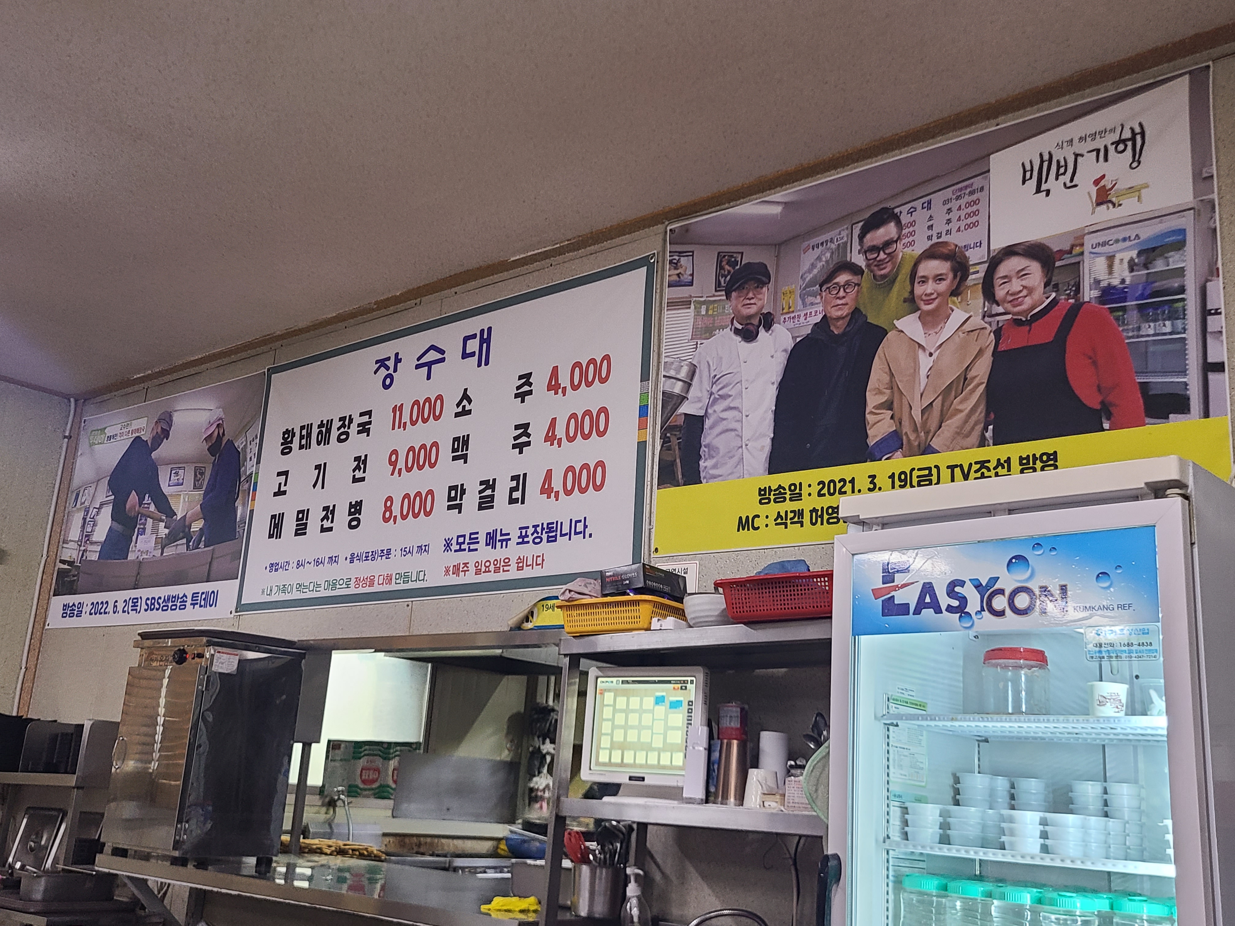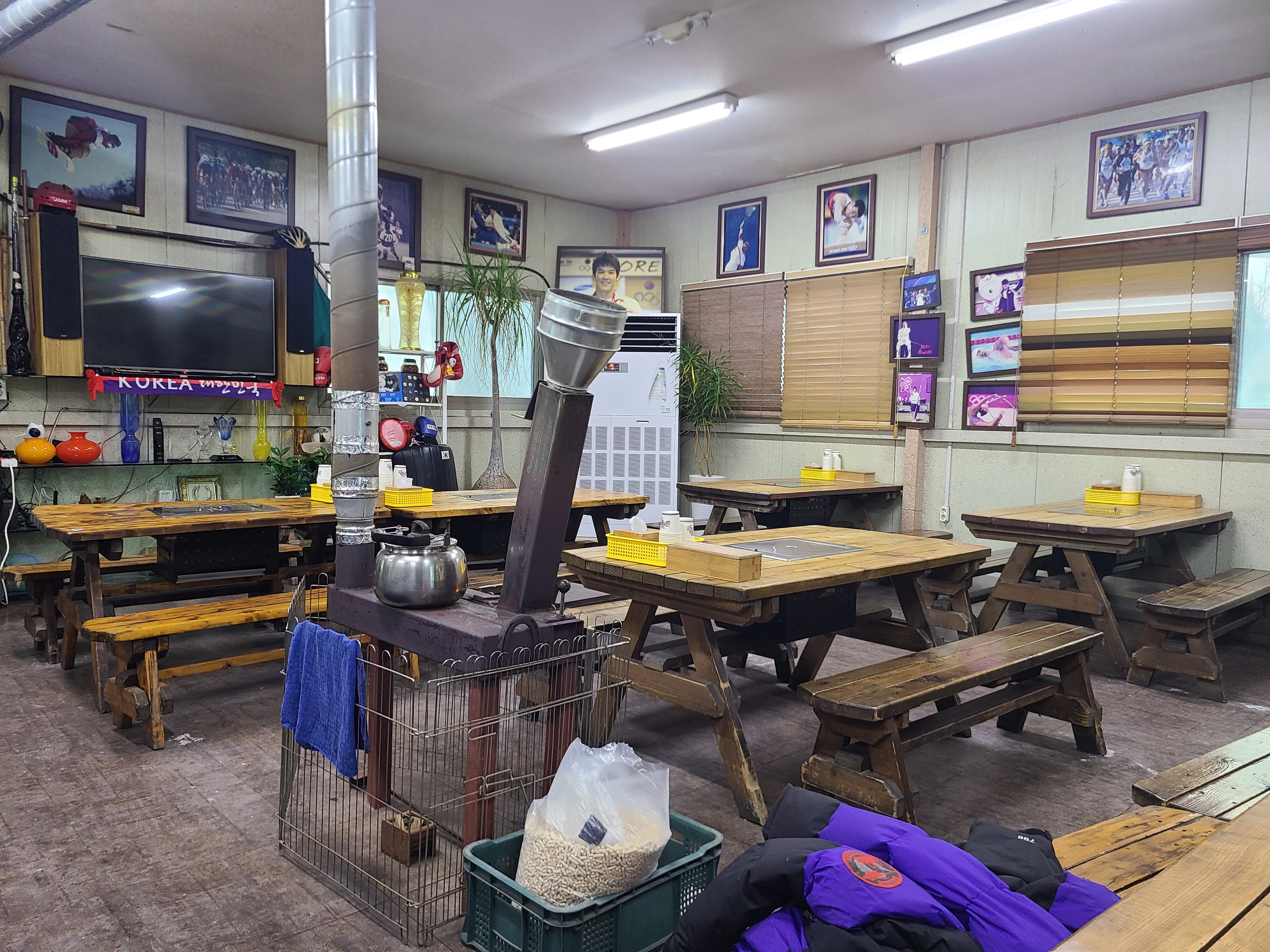 파주 맛집 장수대의 외관은 다소 허름하였고 맛집 포스가 있는 외관이였고 내부에는 방송에 나왔던 사진들과 허영만님이 방문했던 사진이 메뉴판 옆에 있습니다. 정겨운 시골 느낌의 내부에 가운데에는 요즘 보기 드문 난로가 있었습니다. 곳곳에 에 운동선수들 사진들이 걸려있는데 이유는 모르겠습니다.